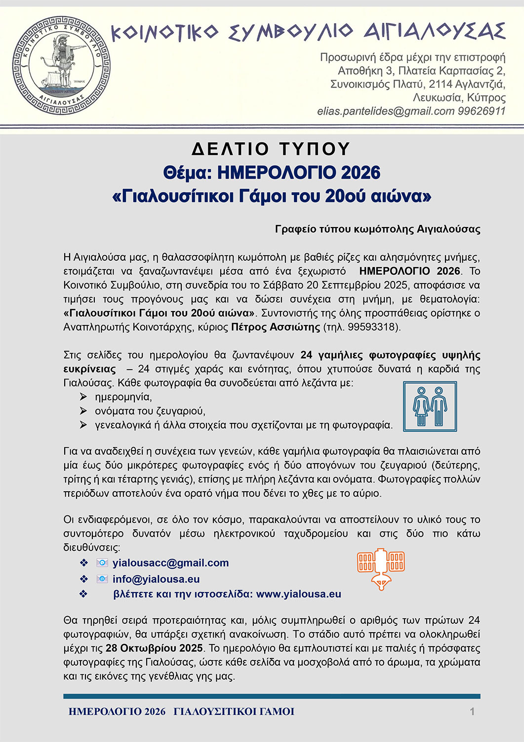Θέμα: ΗΜΕΡΟΛΟΓΙΟ 2026 – «Γιαλουσίτικοι Γάμοι του 20ού αιώνα»